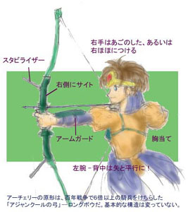さてアーチェリーは、森の民族ヨーロッパ人の狩猟の弓が、 戦場用になったようなものです。走る馬の上と違って、右ななめ前からの 風は受けないから、矢はねらいやすく落ちにくい弓の左側、自分の体側に つがえる。手綱をもちなおす必要がないので、引き絞る右手は 力が入りやすい形で人差し指・中指で弦を引く。これが騎射をあまり行わない ヨーロッパの森の弓、地中海型という射法です。